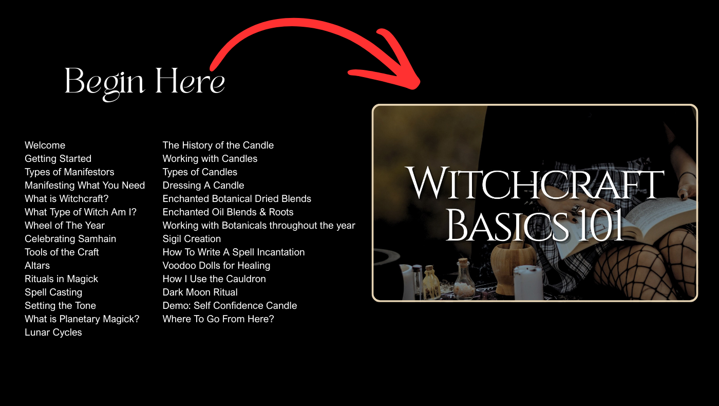 Lessons, exploration videos, ritual PDFs, spell sheets, and grimoire pages that grow over time. Full Witchcraft 101 course for those building their foundation. Advanced material for those ready to go further.